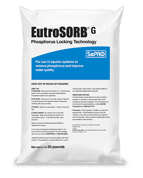 EutroSORB G quickly eliminates phosphorus being released from the sediment “muck” layer. Granular phosphorus binder for sediment control. Fast-acting, safe for fish, no irrigation restrictions, and doesn’t alter water chemistry.